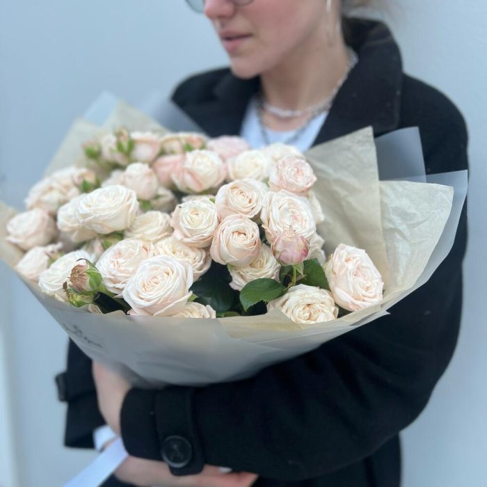 Лента атласная – 1 шт.Кустовая роза Бомбастик – 11 шт.Тишью – 2 шт.Пленка матовая – 2 шт.