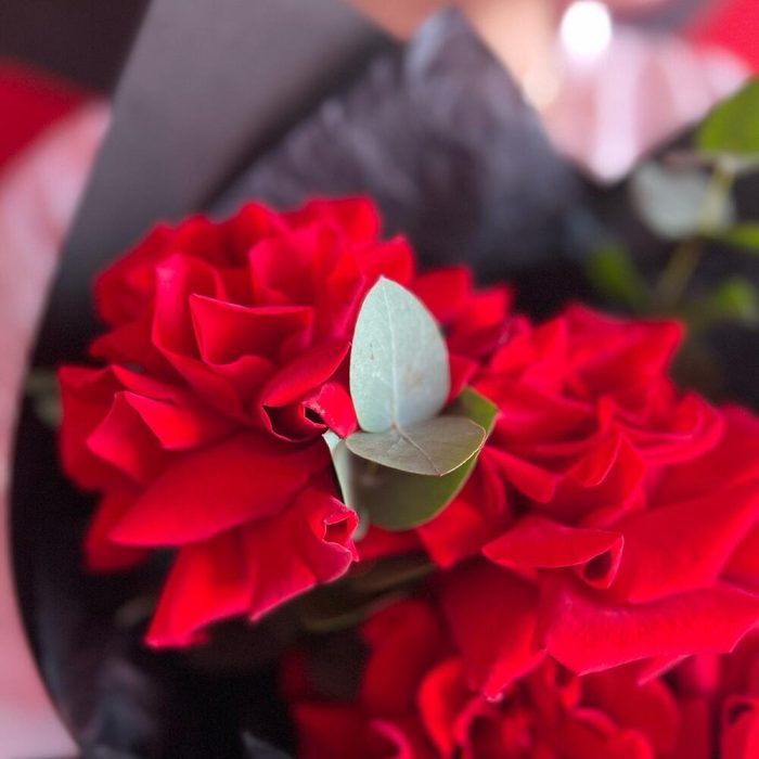 Эвкалипт – 1 шт.Лента атласная – 1 шт.Тишью – 1 шт.фоамиран черный – 1 шт.роза красная французская – 5 шт.