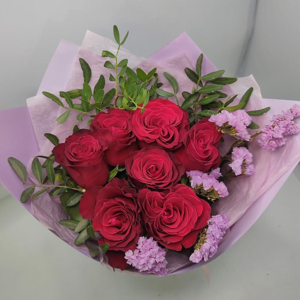 Роза эквадор 50 см – 7 шт.Статица – 1 шт.зелень фисташки – 1 шт.Дизайнерская упаковка – 1 шт.