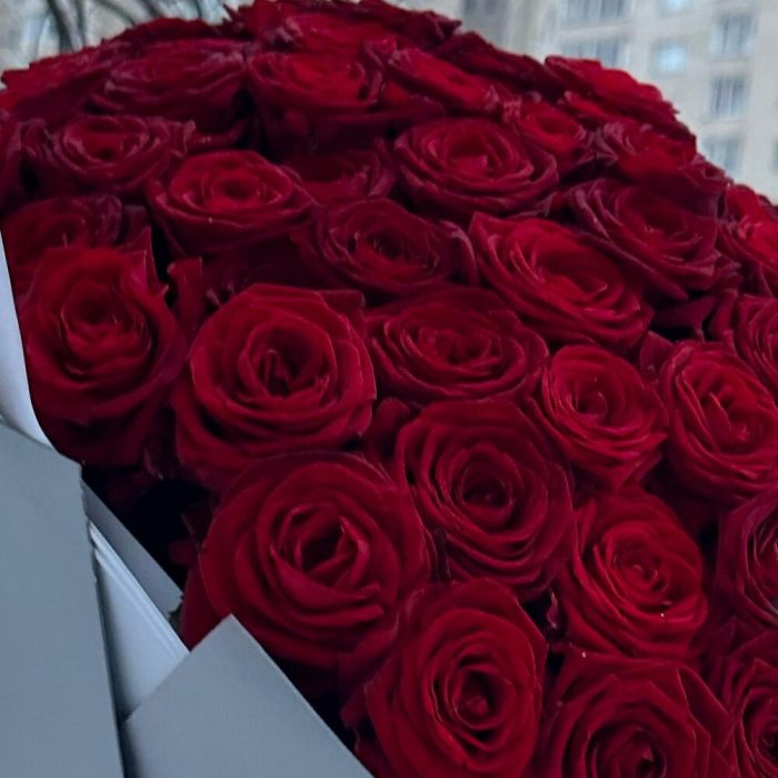Роза красная – 71 шт.Лента атласная – 1 шт.Пленка дизайнерская – 2 шт.