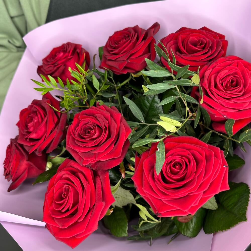 Букет из красных роз с зеленью