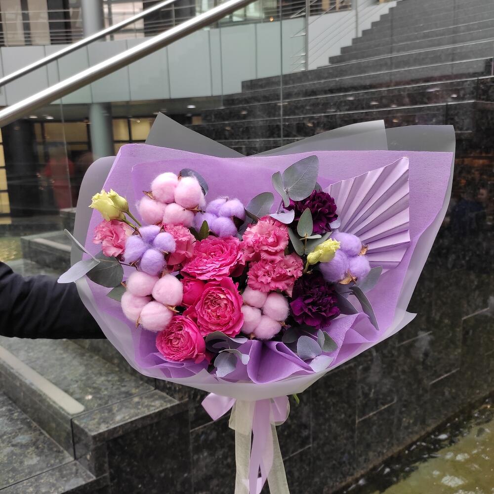 Роза кустовая пионовидная – 1 шт.Лизиантус – 1 шт.Диантус – 2 шт.Хлопок – 6 шт.Пальма – 1 шт.Эвкалипт – 1 шт.Лента – 2 шт.Упаковка дизайнерская – 2 шт.