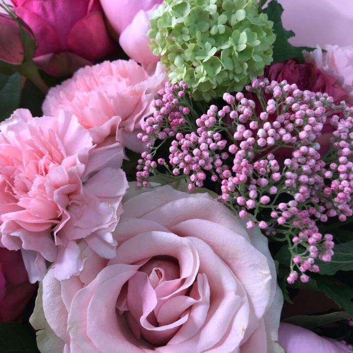 Оформление – 1 шт.Пион – 2 шт.Роза садовая – 3 шт.роза фрутетто – 3 шт.Диантус – 3 шт.Озотамнус – 2 шт.Вибурнум – 1 шт.Салал – 7 шт.